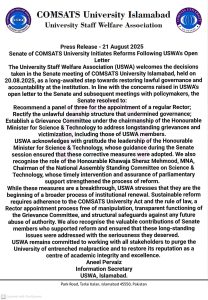 Despite these positive changes, USWA stressed that these measures are only the beginning of a broader effort to improve university governance. The association emphasized the need for continued adherence to the COMSATS University Act, transparent appointment processes, and the implementation of legal safeguards to prevent future misuse of authority. USWA reaffirmed its commitment to working alongside all stakeholders in promoting trust, excellence, and good governance at COMSATS University.