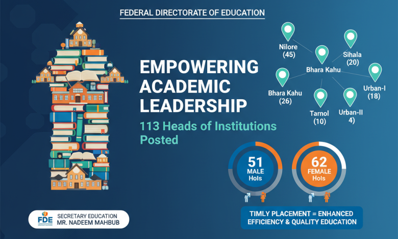 The Federal Directorate of Education, under the guidance of Secretary Education Nadeem Mahbub, has completed the posting of Heads of Institutions across 113 educational sites in Islamabad and adjoining areas to strengthen institutional leadership as the new academic session begins.